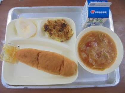 今日の給食は、豆乳マカロニグラタン(米粉)とトマトスープ、なし(二十世紀)パン、牛乳です。