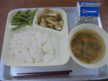 今日は、ホイコウローと中華スープ、えだまめ、ごはん、牛乳です。