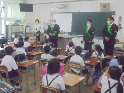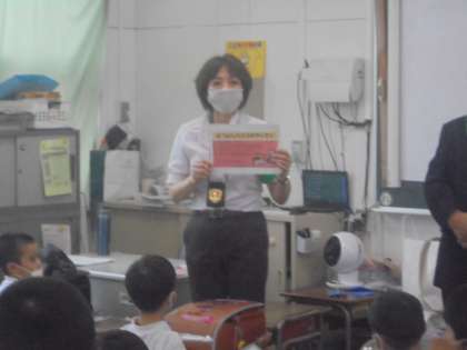 (上)1年生の子どもたちに、防犯笛をいただきました。