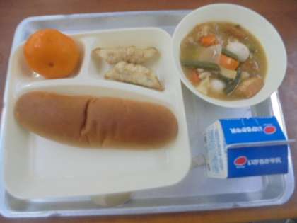 今日の給食は、あげぎょうざと中華煮、みかん(冷)、パン、牛乳です。