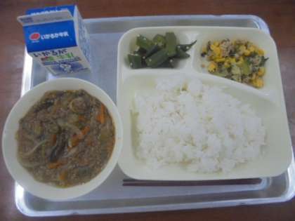 今日の給食は、マーボーなすとオクラの甘酢あえ、ツナとチンゲンサイのいためもの、ごはん、牛乳です。