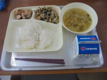 今日の給食は、さけのしょうゆ風味焼きと五目汁、高野どうふのいり煮、ごはん、牛乳です。