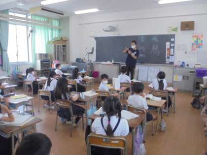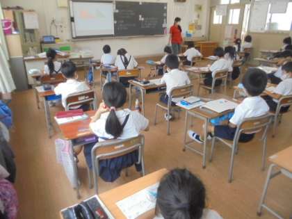 (中)「ニャーゴ」の紙芝居グループを決めています。