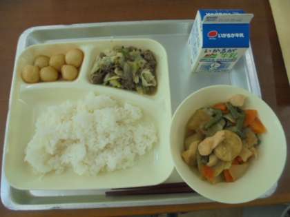 今日の給食は、一口がんもとさといものみそ煮、牛肉と野菜のいためもの、みたらしだんご、ごはん、牛乳です。※月見の行事献立