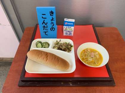 今日の給食は、ほたて貝とトマトのスープスパゲッティ、牛肉のカレー風味やき、きゅうりのサラダ、黒糖パン、牛乳です。