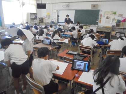 (上)タブレット端末を使って、かぶとむしの絵を描いています。