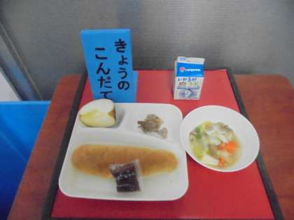 今日の給食は、豚肉のガーリック焼き、豚肉と野菜のスープ煮、りんご、パン、牛乳です
