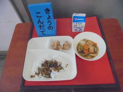 今日の給食は、鶏肉のたつたあげ、あつあげと野菜の煮もの、おかかなっ葉、ごはん、牛乳です。