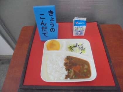 今日の給食は、ハヤシライス(米粉)、キャベツのひじきドレッシング、黄桃(缶)、ごはん、牛乳です