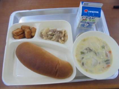 今日の給食は、はくさいのクリーム煮、あつあげのピリ辛じょうゆかけ、豚肉とれんこんのオイスターソースいため、パン、牛乳です。