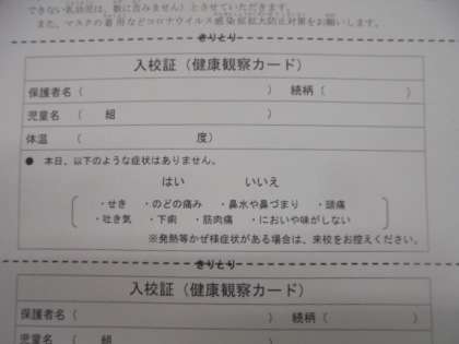 ・本日、運動会の入校証(健康観察カード)をお配りしました。当日、来校