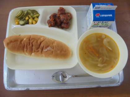 今日の給食は、まぐろのオーロラ煮、ベーコンとじゃがいものスープ、きゅうりとコーンのゆずドレッシング、パン、牛乳です。