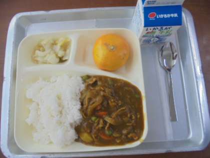 今日の給食は、ポークカレーライス(米粉)、はくさいのピクルス、みかん、ごはん、牛乳です。