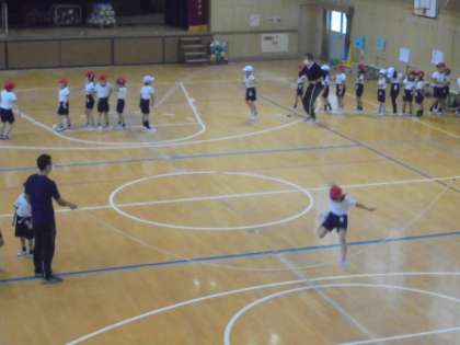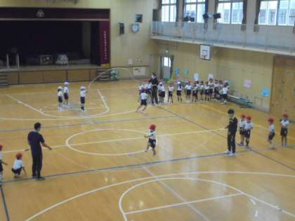 (上・中)体育館で、長縄を跳んでいます。