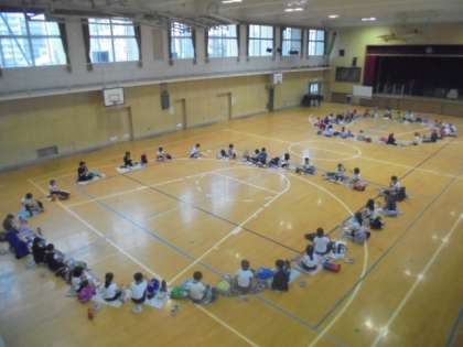 1組と3組は体育館で、2組は家庭科室でお弁当を食べました。