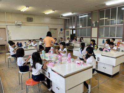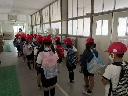 でも、そこは何でも楽しめる一年生。お弁当の時間にはリュックに水筒、赤白帽姿で、体育館と家庭科室に分かれてミニ遠足。みんなで楽しくお弁当を食べました。家庭科室では密を避けるためにハス向かいになって座りました。