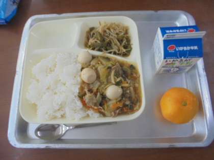 中華丼、もやしとさんどまめの中華あえ、みかん、牛乳です。