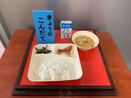 みそ汁、あかうおのしょうゆだれかけ、こまつなのいためもの、ごはん、牛乳です。