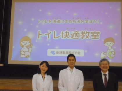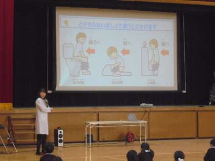 今日は、2年、3年、4年生の子どもたちに、「トイレのきれいな使い方」についての特別授業をしていただきました。講師は、昨日に続いて小林製薬株式会社の皆様です。トイレの汚れを「モンスター」に置き換えて、わかりやすく教えていただきました。