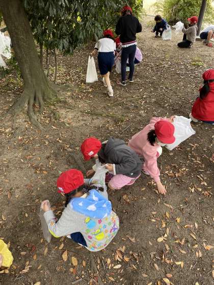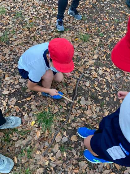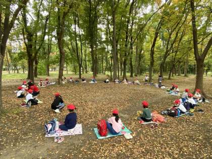 おやつも食べたら、どんぐり拾いに落ち葉拾い。枯れ枝を楽器に見立てて演奏。