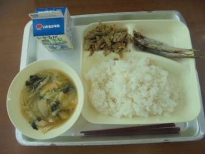 焼きししゃも、五目汁、きんぴらごぼう、ごはん、牛乳です。