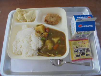 カツカレーライス、カリフラワーのピクルス、いり黒豆、牛乳です。