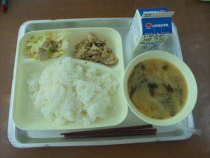 鶏肉のごまだれ焼き、なめこのみそ汁、キャベツのいためもの、ごはん、牛乳です。