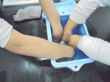 (中・下)理科「もののあたたまり方」実験中。