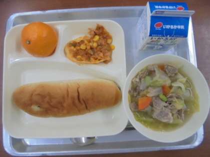 豚肉と野菜のスープ煮、変わりピザ、みかん、パン、牛乳です。