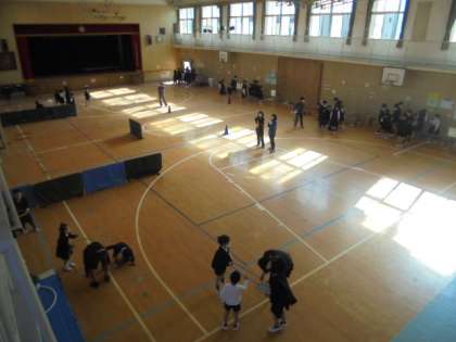 体育館では、空き箱積みやフラフープダウン、ペンイ、UFOゴルフ、ボール胴上げ、新聞ビリビリなど、楽しいゲームをしています。