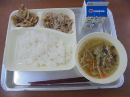 豚肉のねぎじょうゆ焼き、すまし汁、れんこんのおかかいため、ごはん、牛乳です。
