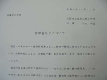 教室では必要に応じて暖房を行っていますが、同時に換気もしていますので、お子さんの体調が気になる場合は、登校時に標準服の上に防寒具を着せ、状況によっては教室内でもそのまま着用することも可とします。この場合は、連絡帳などで担任へお知らせいただきますよう、ご協力のほどよろしくお願いします。なお、授業の活動内容や教室内の温度によっては、防寒具をとることもありますので、どうぞよろしくお願いします。