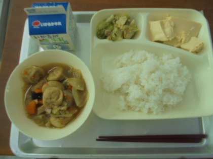卵どうふ、鶏肉と一口がんもの煮もの、野菜のそぼろいため、ごはん、牛乳です。