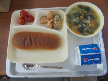 さけのマリネ、肉だんごと麦のスープ、プチトマト、パン、牛乳です。