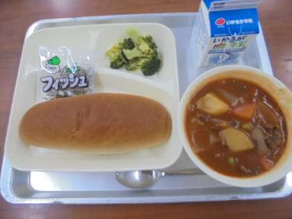 今日の献立は、ビーフシチュー、ブロッコリーのサラダ、ミニフィッシュ、パン、牛乳です。