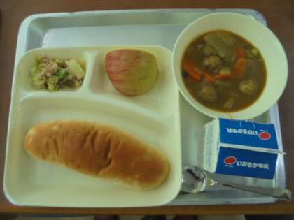 ミートボールと野菜のカレー煮、ツナとキャベツのソテー、りんご、パン、牛乳です。