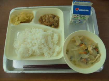 鶏肉の甘辛焼き、かす汁、くりきんとん、ごはん、牛乳です。