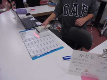 (下)図書室で本の貸出をしています。さすが、4年生!