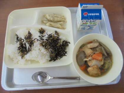 献立は、いわしてんぷら、あつあげと野菜の煮もの、ごまひじき、ごはん、牛乳です。