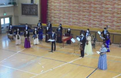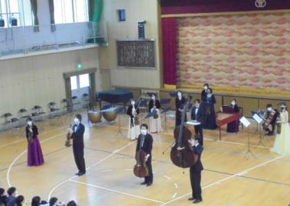 文化庁の「文化芸術による子ども育成総合事業(巡回公演事業)」によるオーケストラ公演を行いました。来演してくださったのは、全国的に活躍されている大阪の管弦楽団「テレマン室内オーケストラ」の皆さん、総勢21名。本格的なプロの演奏に子どもたちは、聞き入っていました。