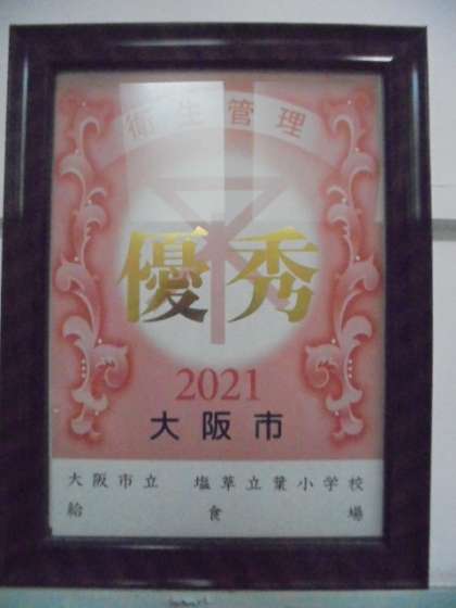塩草立葉小学校の給食調理場に対して、大阪市から優秀標章をいただきました。給食調理員の皆さんが、衛生面にいつも気をつけてくださっているおかげです。