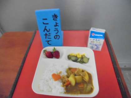 ポークカレーライス、きゅうりとコーンのサラダ、いちご、牛乳です。