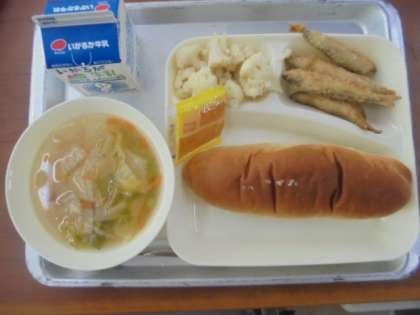 わかさぎフライ、はくさいのスープ、カリフラワーのサラダ (アプリコットジャム)、パン、牛乳です。