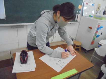 (上)子どもたちのさんすうノートのまるつけをしています。