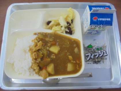 チキンカレーライス、ビーンズサラダ、ミニフィッシュ、牛乳です。