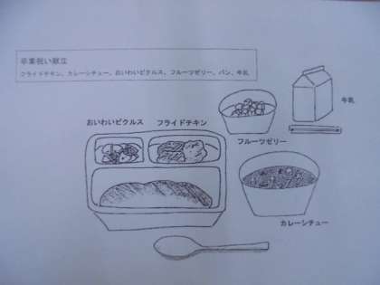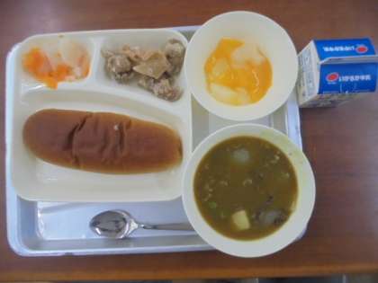 フライドチキン、カレーシチュー、おいわいピクルス、フルーツゼリー、パン、牛乳です。