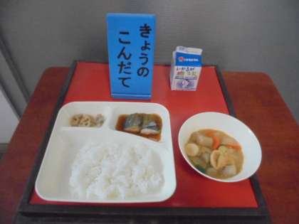 さごしのおろしじょうゆかけ、一口がんもとさといものみそ煮、れんこんのいためもの、ごはん、牛乳です。