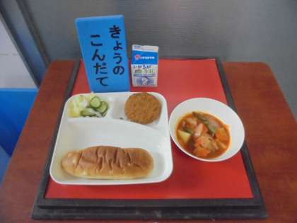 チキンレバーカツ、ケチャップ煮、キャベツときゅうりのサラダ、パン、牛乳です。
