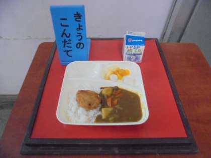 今日の献立は、カツカレーライス、フルーツ白玉、牛乳です。
