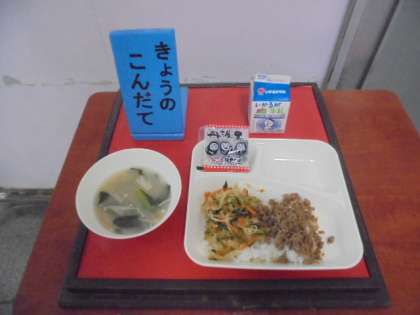 今日の献立は、ビビンバ、トック、いり黒豆、牛乳です。